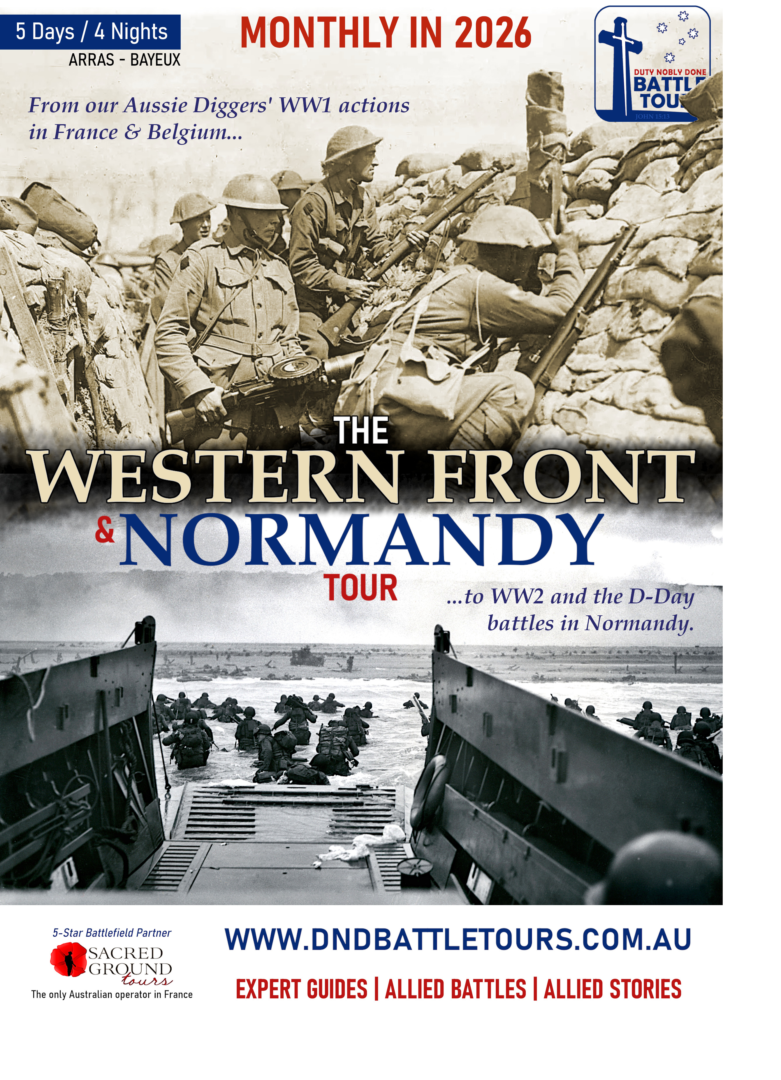 From our Diggers' actions acoss France & Belgium on the Western Front, to WW2 and the D-Day battles in Normandy where the 'greatest generation' saved civilisation. It is an opportunity you just have to take!