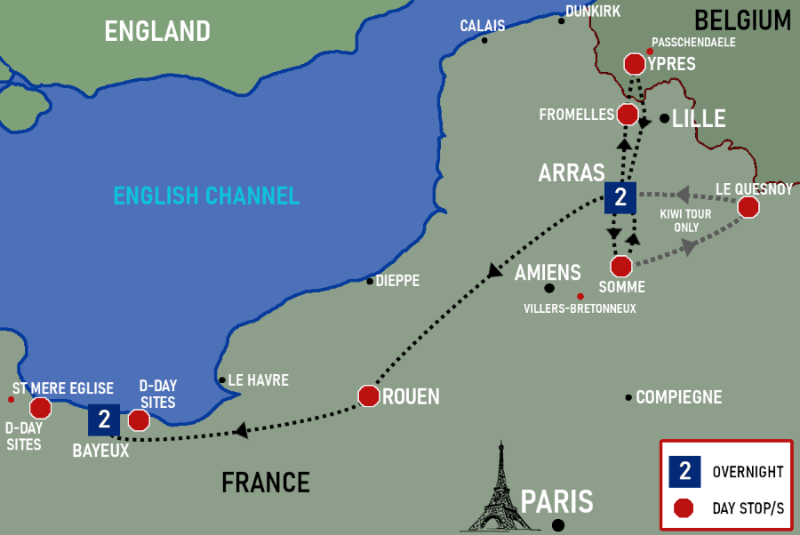 The "Western Front to Normandy” tour is perfectly designed for those who love history and have limited time to see everything they want. If you are on your European trip of a lifetime, and came to see where the Anzacs fought, then why not check out the D-Day sites of Normandy while you're here? It's just down the road. Don't deal with all the stress of arranging an itinerary, accommodation, car hire and getting lost when all you need to do is relax and enjoy 5 days of battlefield touring and historic sites across WW1 & WW2.